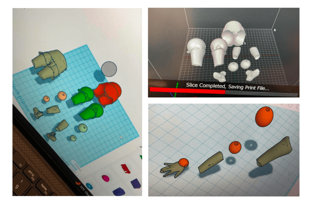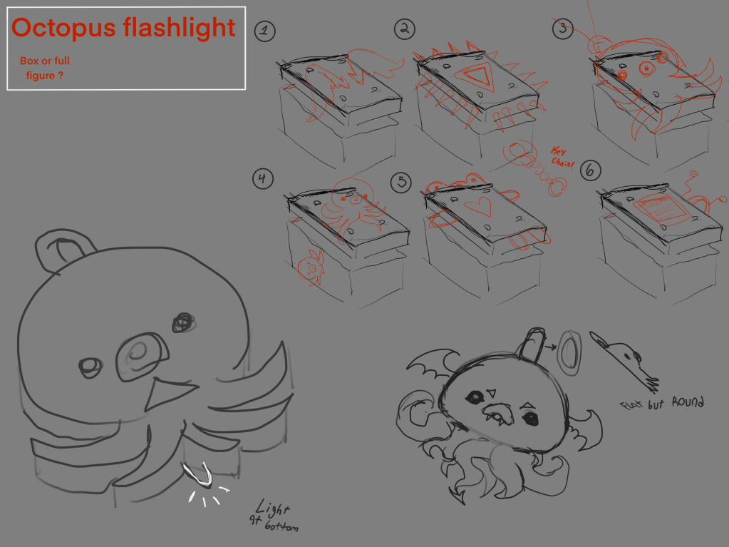 Product Design Fusion 360 model work 3D printed model of fusion 360 work Finished product of shark with legs plushie Planning phase of Caine keychain Finished product of Caine keychain Planning of octopus flashlight Finished product of Octopus flashlight